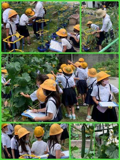 火曜日のホームページでもお伝えしたように学習園の植物や自分の植木鉢で育てている野菜がどんどん成長しています。今日は2年生がきゅうりを見に来ていました。きゅうりのトゲトゲ、葉っぱのザラザラ…、見るだけではなく、さわった感触にも発見が!とても大事な学習です。