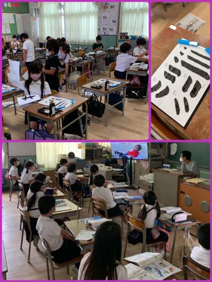 1組は習字、毛筆の学習に取り組んでいました。始まったばかりの習字。筆の入り方を何度も練習していました。