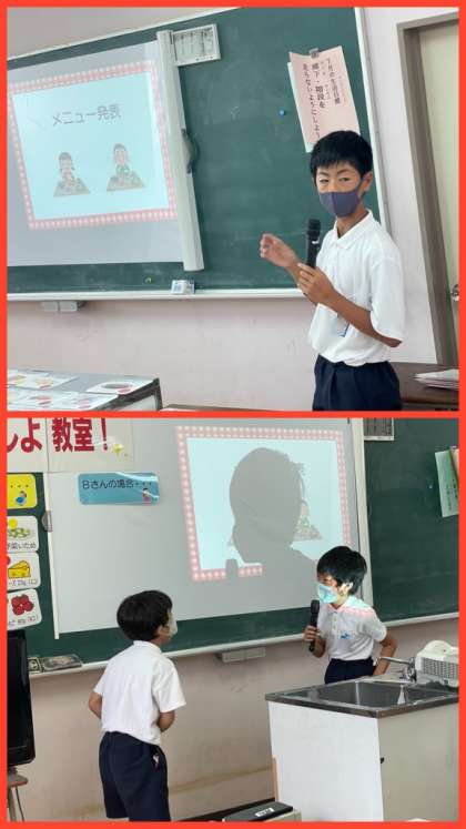 グループに分かれて朝食の献立を考え、発表しました。どのグループも栄養の偏りがないようにしっかりと考えられていました。