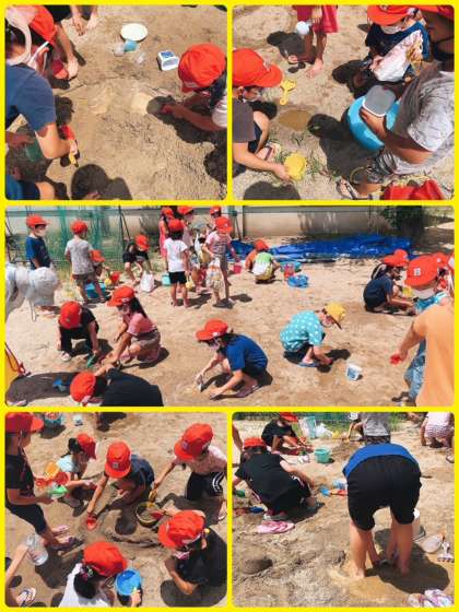 おうちから持ってきた服に着替えて、砂場の前に集合。そして、スタート!写真から楽しんでいる様子がわかると思います。時間いっぱいまで、思う存分楽しみました。