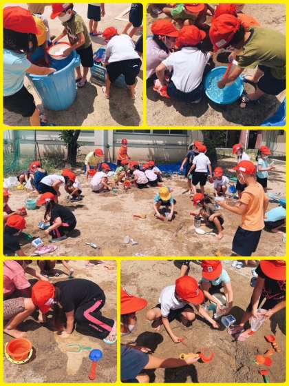 待ちに待った「どろんこあそび」を今日の3時間目に行いました。登校のときから「はやくやりたーい」という楽しみな気持ちが伝わってきました。