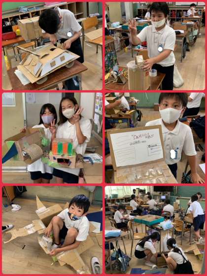 2組の図画工作の様子。ダンボールを使った作品が続々と出来上がってきています。どんな思いでその作品を作ったのか、また聞かせてくださいね。
