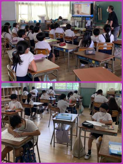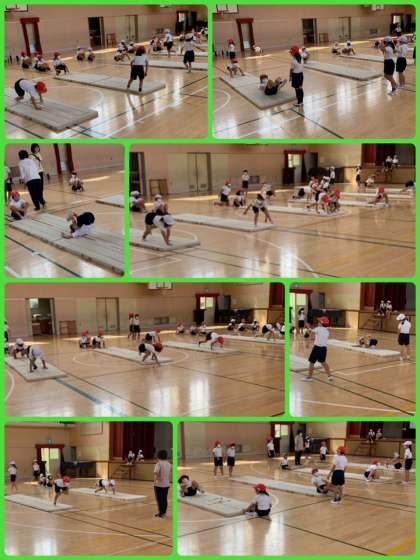 2年生は「マット遊び」の学習。犬になって歩いたり、前転がりをしたり、全身を使って運動していました。中には少し体が硬そうな人も。お風呂上がりにぜひストレッチを。できるスペースがあるなら、お布団でぜひ前転がりの練習を。