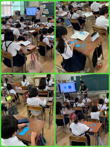 2年生の算数は「長方形と正方形」の学習に入りました。今日は三角形や四角形を使って「かたちづくり」にチャレンジしていました。