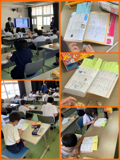 「今日は、わからない言葉を辞書で調べるのではなく、わかる・知ってる言葉に付箋を貼っていきましょう」