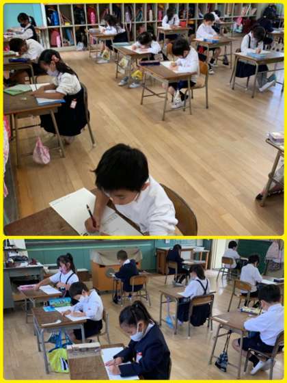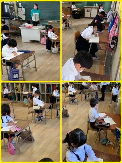 約束通り、一画一画ていねいに書くことができています。本当にすばらしい1年生です!感心しました。結果をお楽しみに。