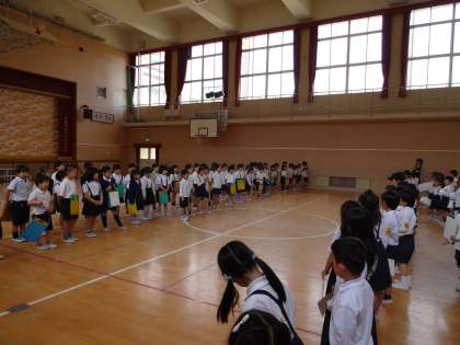 1年生は理科室や音楽室など一度も行ったことのない教室を2年生と仲良く手をつないで回りました。