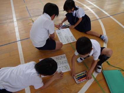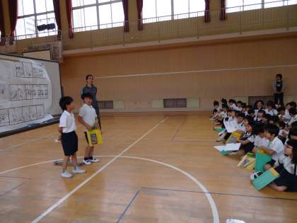 生活の学習で、1年生と2年生は学校の中を一緒に探検しました。