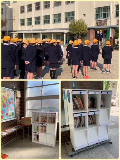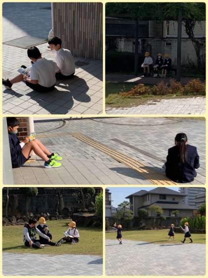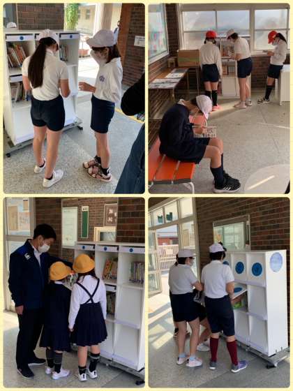 感染症の恐れもあり、ストップしていた玄関の図書スペース。ついに今日からスタートしました。児童朝会で図書委員会からのお知らせもあり、運動場が使えない学年の子どもたちが来て、青空の下で本を読む姿が見られました。