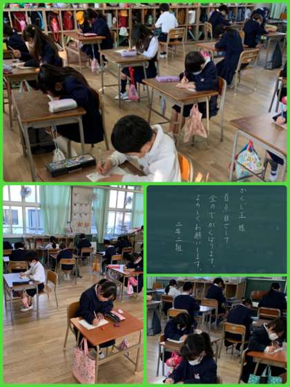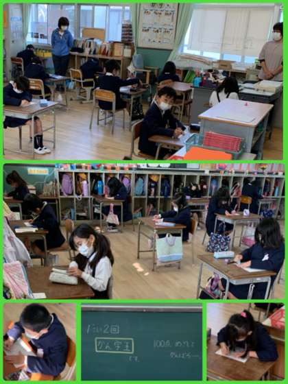 今日は2年1組2組のみなさんが漢字王にチャレンジしました。「ていねいに書くこと」「時間いっぱいまで何度も見直すこと」この2つをめあてに取り組みました。めあての通りに自分の名前からていねいに書く2年生。結果もすばらしかったですよ。楽しみに待っててね。