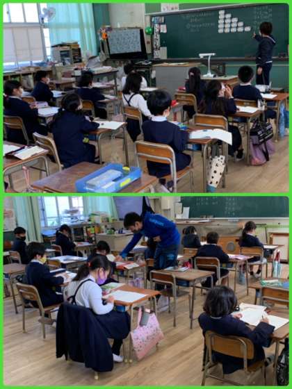 3年生の算数は「重さのたんいとはかり方」の学習。今日も3つに分かれて取り組んでいました。はかりの目盛りの読み方をみんなで考えていました。よく見て考えてね。
