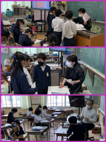 3年生は3つに分かれての学習。一人一人のノートを先生たちがチェックしながらすすめていました。おうちでも復習をしておこうね。