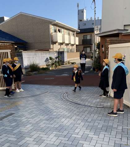 みな小あいさつ隊は今日から6年2組。5名のみなさんが来てくれました。