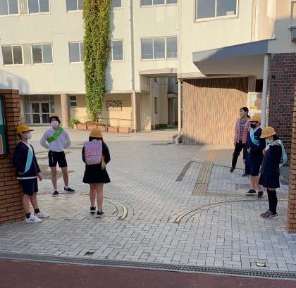 みな小あいさつ隊は6年2組ファイナル。4名のみなさんが来てくれました。今日も気持ちのよい朝です。ありがとう!