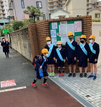 みな小あいさつ隊は今日から5年生、今日は1組の5名のみなさんが来てくれました。