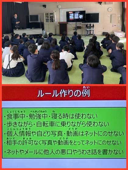 本校でも学年関係なくスマホを持つ児童が増えています。「みんな持っているから私も」とねだる子も今後出てくると思います。しかし、本当に子どもたちの生活に必要なのか、お子さんの発達段階を考え、利便性と危険性を天秤にかけ、各ご家庭で判断をお願いします。「持たせる」と判断したご家庭は、子供任せにせず、「部屋に持ち込まない」「食事中は使わない」「メールは保護者も確認する」など約束事を決めて、責任をもって所持させてください。遊びで壊れた、メールで悪口を言われた、オンラインゲームの課金トラブル等の問題が起こった場合、学校での解決はできません。また、トラブルや犯罪に巻き込まれないようにフィルタリング設定、定期的な利用状況チェック等をよろしくお願いします。