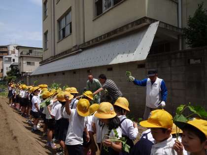 子供たちは初めて見るサツマイモの苗に興味津々で丁寧に畝に植えつけていました。