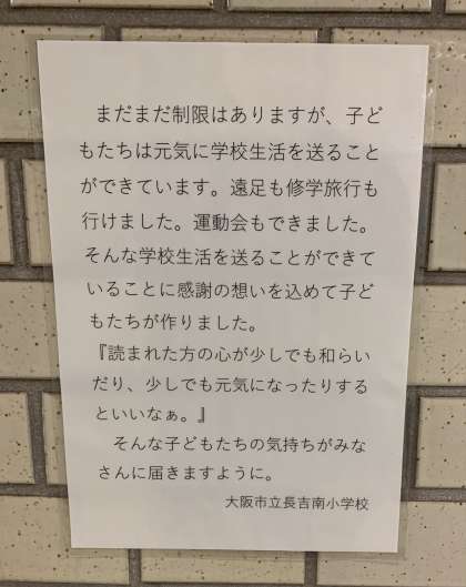 普段みなさんがよく使われている出口とは反対の方になりますので紹介します。機会がありましたら、ぜひ子どもたちの想いをご覧になってください。来年の3月まで掲示していただく予定です。
