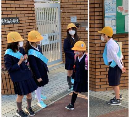みな小あいさつ隊は今週から4年生。今日は1組4名が来てくれました。