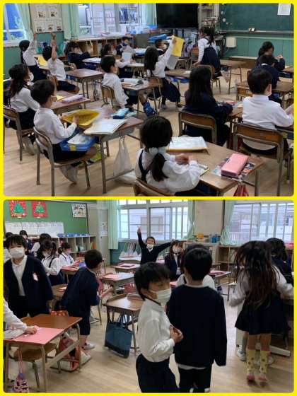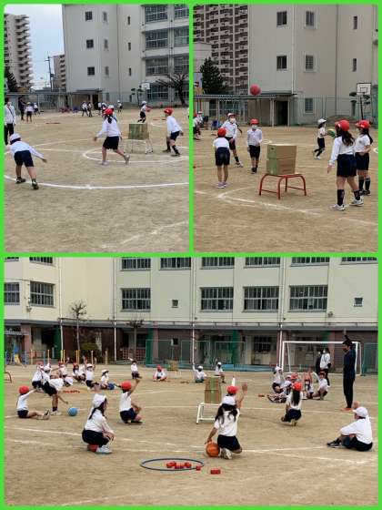 2年生の体育の学習は「的あてシュートゲーム」。攻めと守りに分かれて、攻めはコートのまんなかにある的(ダンボール)を当てて台から落とします。守りはそうはさせじとブロックします。結果はどうだったのかな?