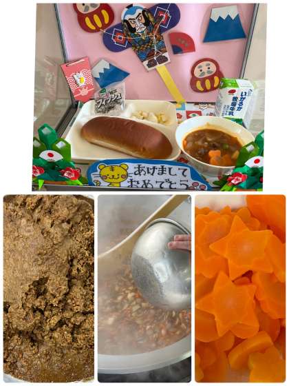 シチューのルウは小麦粉と綿実油で手作りしたブラウンルウ(写真左下)。今日もにんじんが星やミッキーマウスに変身していました!子どもたちに少しでも楽しくおいしく食べてもらえるように、調理員さんが工夫してくれているのです。ありがとうございます。