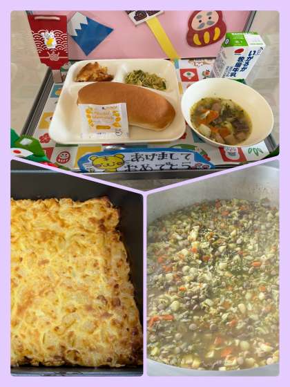 今日の給食献立は『ポトフ、カレーソテー、桃のクラフティ、パン、マーマレード、牛乳』でした。