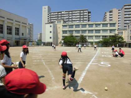 ソフトボール投げでは、遠くをめがけて、勢いよくボールを投げました。