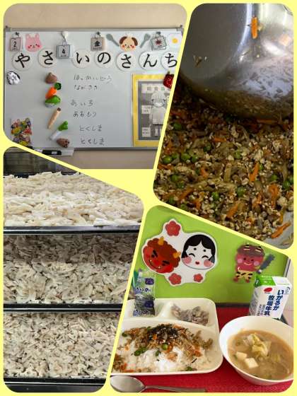 給食室には「やさいのさんち」のコーナーが。今日の献立に使われている野菜は、北海道の玉ねぎに長崎のにんじん、れんこんは徳島、、と子どもたちにもわかりやすく安心して食べられるように、調理員さんが毎日書いてくれています。給食当番さんは見てくれているかな?