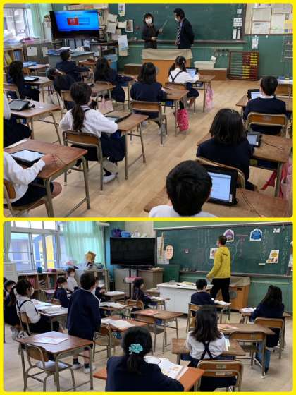 1年生もタブレット端末を使っての学習に取り組んでいます。今日はICT支援員の方と一緒に学習をすすめていました。IDやパスワード入力は大変なようですが、操作はずいぶん慣れてきました。