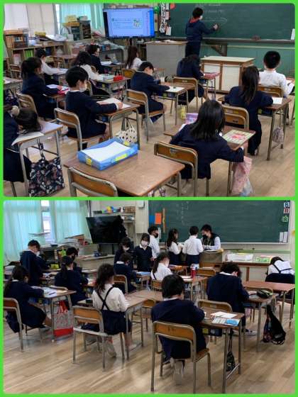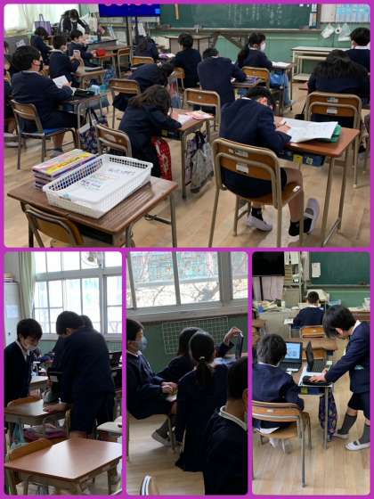 3年2組はグループに分かれて、タブレット端末を使っての調べ学習。自分の担当箇所は調べることができてかな?