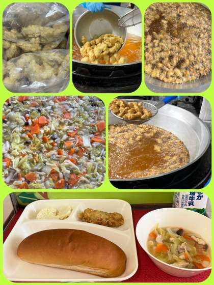 今日の給食献立は『白身魚のフリッター、洋風煮、カリフラワーのサラダ、黒糖パン、牛乳』でした。
