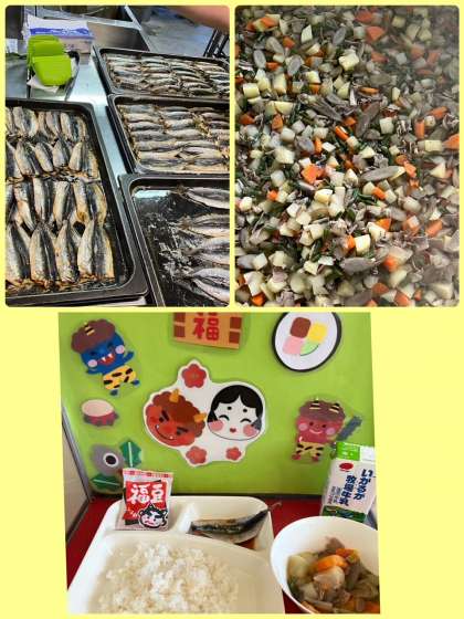 今日の写真は、いわしのしょうがじょうゆかけと含め煮ができあがったときの様子です。今日も残さず食べて、心のオニを追い払おう!「おにはー、そとー」