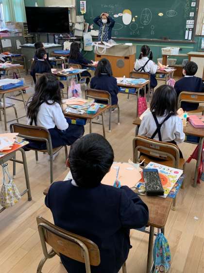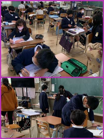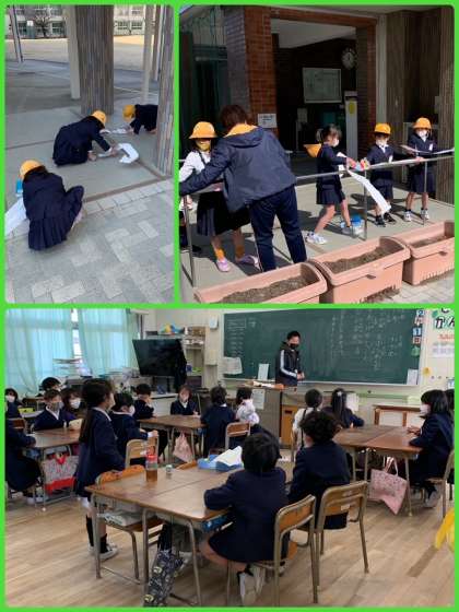 一人ずつ「1メートルたろう」を持って、学校のいろいろなところの長さを測っていました。廊下ですれちがったところ、「校長先生の身長も測らせてほしい」とのことで、測定開始。「1メートルたろうとおなかまで」という結果でした。どんどん測って、楽しみながら量感を養ってほしいです。