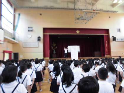 全学年が講堂に集まり、「ビリーブ」を歌いました。いい声を出すために軽くじゅんび運動を。そして5年生の声出しを見本にみんなで発声練習をしたあと、「ビリーブ」を歌いました。講堂中にきれいなすきとおった声が響いていました。心がおだやかになりました。