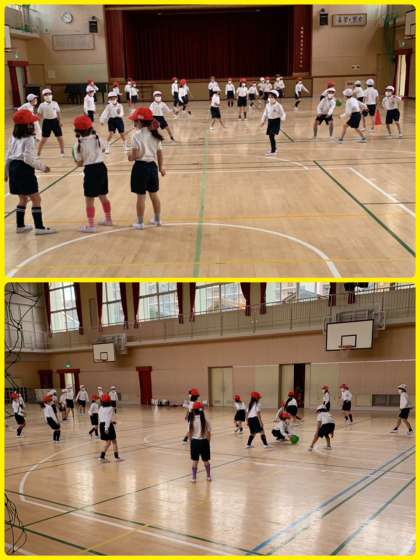 休み時間にも楽しそうに「ドッヂボール」をしている1年生。今日は、体育の時間にも全員で楽しく取り組んでいました。