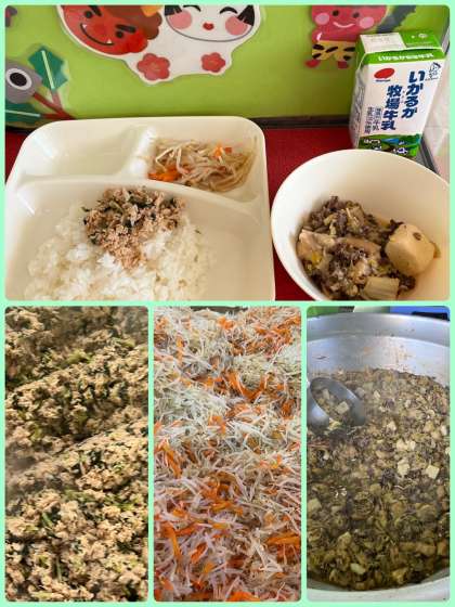 今日の給食献立は『すき焼き煮、もやしとにんじんの甘酢あえ、ツナっ葉いため、ごはん、牛乳』でした。