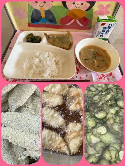 今日の給食献立は『いわしフライ、みそ汁、きゅうりの赤じそあえ、ごはん、牛乳』でした。