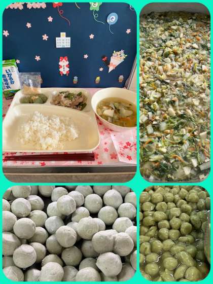 今日の給食献立は『豚肉とれんこんのいため煮、五目汁、きな粉よもぎだんご、ごはん、牛乳』でした。