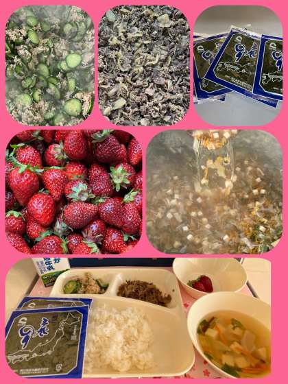 写真上の2枚は、手巻きごはんにのせるツナソテーと牛肉の甘辛煮です。今日は子どもたちも自分で手巻きをして食べるので、みんな大喜びで食べていました。6年生はよりおいしく感じたかな?