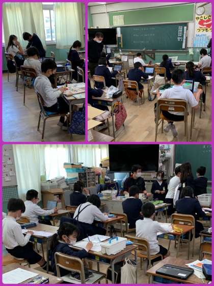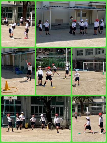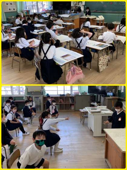 1年2組では、「むかしあそび はっぴょうかい」が行われていました。けんだま、こままわし、おてだま、だるまおとし…、練習通りうまくいったかなぁ?