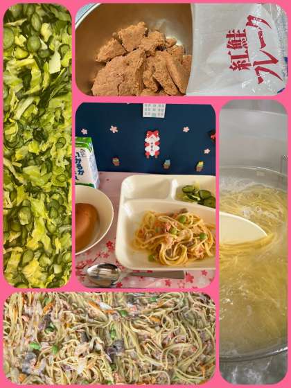 今日の給食献立は『さけのクリームスパゲッティ、キャベツときゅうりのサラダ、黒糖パン、牛乳』でした。