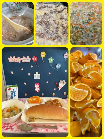 今日の給食献立は『とうふのミートグラタン、押麦と野菜のスープ煮、デコポン、コッペパン、バター、牛乳』でした。