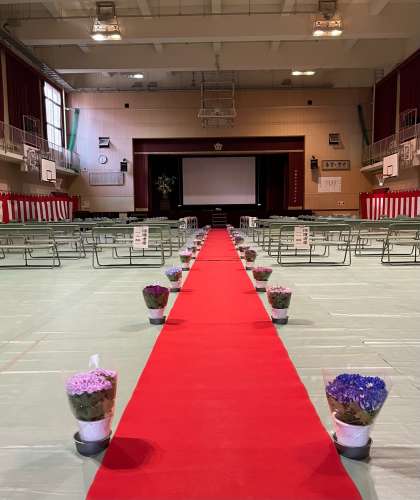 講堂にシートを敷き、紅白幕を張り、椅子を並べ、赤じゅうたんを敷き、きれいな花を並べました。雨が降らないことを祈りながら、運動場を平らに整備し、まっすぐな白線を引きました。