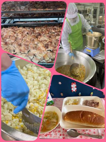 今日の給食献立は『豚肉のガーリック焼き、スープ、カリフラワーとコーンのサラダ、おさつパン、牛乳』でした。