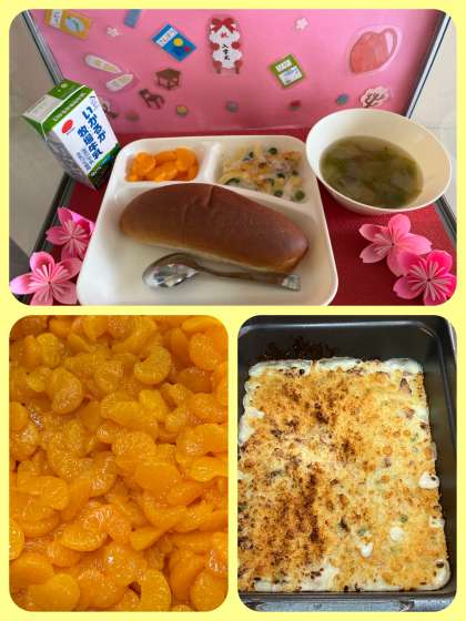 今日の給食献立は『マカロニグラタン、レタスのスープ、みかん(缶)、黒糖パン、牛乳』でした。