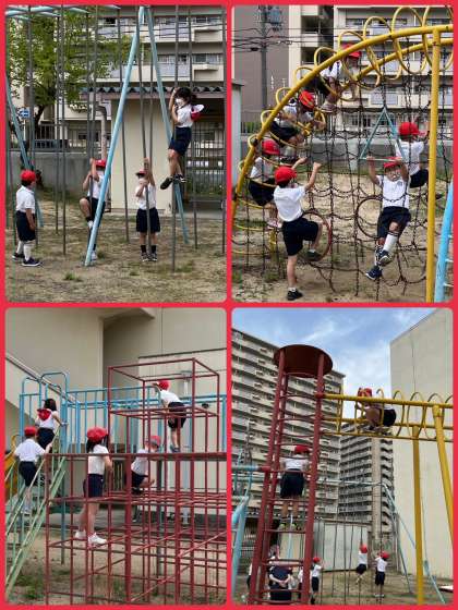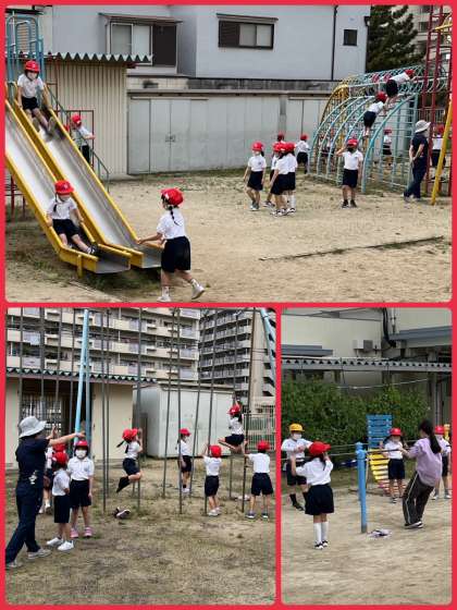 今日は運動場で体育の学習。「遊具の使い方」も学習しました。ルールを守って、仲良く、けがをしないように遊んでいきましょうね。