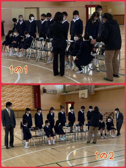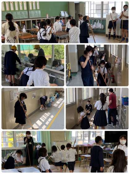6年生のみなさんが1年生のおそうじのお手伝いに来てくれています。ほうきの使い方やぞうきんのしぼり方、ていねいに教えてあげてね。