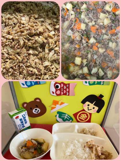 味がしっかり染みた肉じゃがと、ごまかかいためは、たけのこのシャキシャキとした歯ごたえがあり、とてもおいしかったです。ご飯にもぴったりの献立でした。