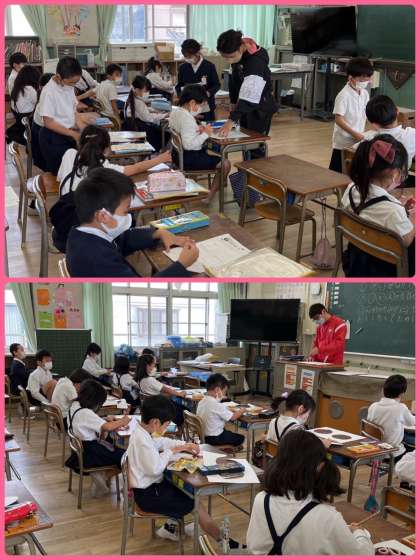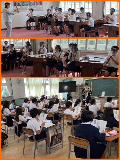 4年生の音楽の学習。手洗い、消毒、換気、距離をとり、フェイスシールド….、感染症対策を徹底しながら、リコーダーに取り組んでいます。がんばれ!4年生!