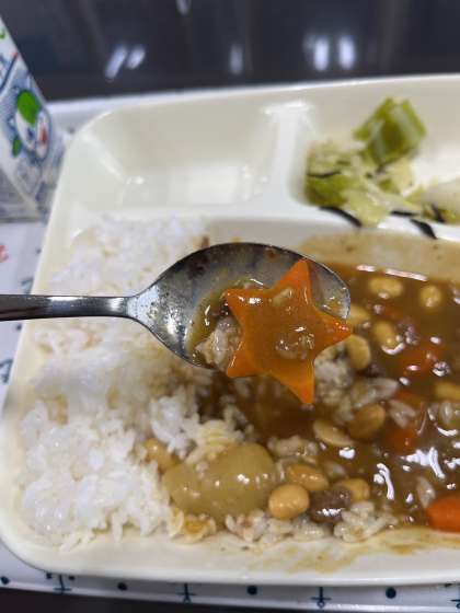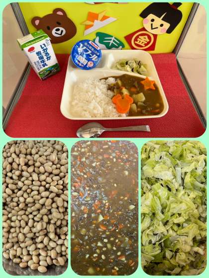 今日の給食献立は、『牛肉と大豆のカレーライス、キャベツのひじきドレッシング、ヨーグルト、牛乳』でした。